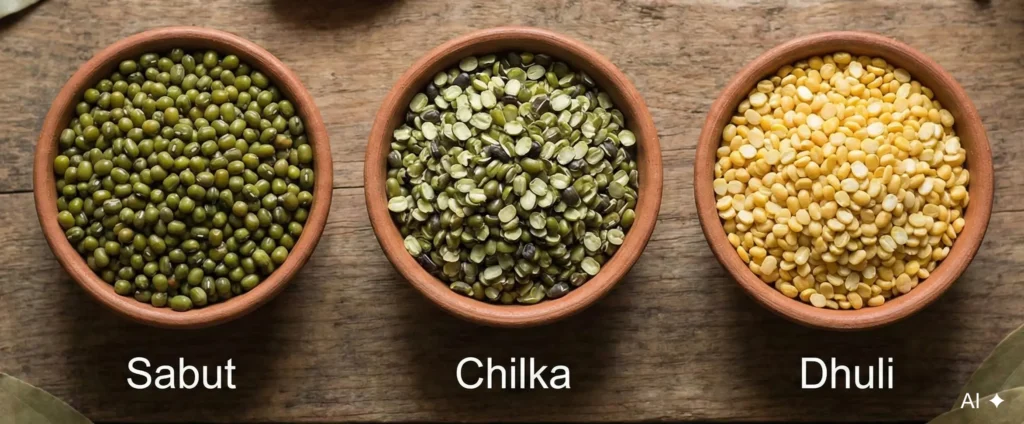 | Split Green Gram (Moong Chilka) | Split yellow interior with green edges. | Lighter dals, easy digestion. |