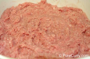 1. En un bol, añade el cordero picado y 1/2 taza de agua y mezcla bien con un movimiento circular; añade más agua gradualmente si es necesario. El cordero debe perder la textura fibrosa y convertirse en una pasta para evitar que se formen grumos durante la cocción.