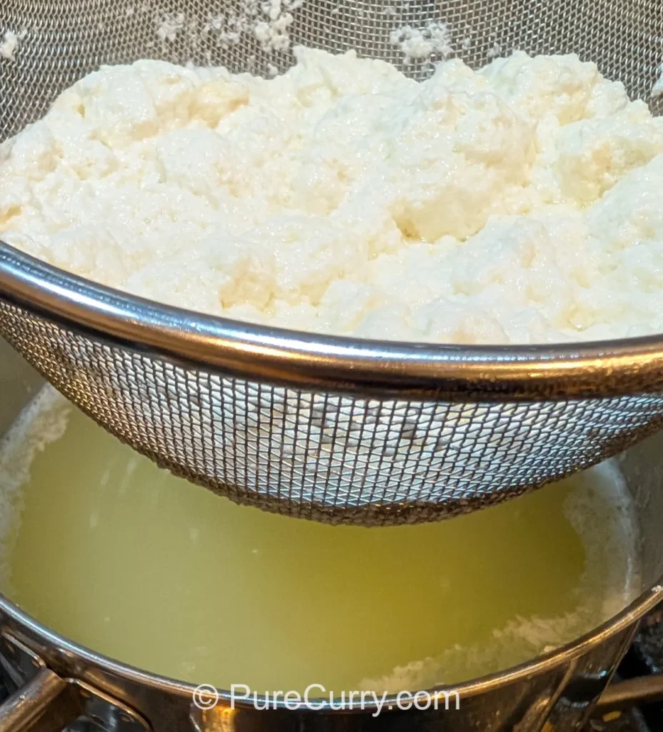 2. Pour the curdled milk into the cheese cloth and completely drain the whey.