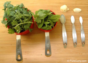 This recipe calls for a total of 3 cups of loosely packed herbs, which is approximately 1 large bunch of cilantro and 1 small bunch of mint.