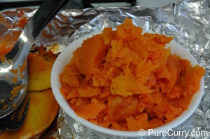 1. You need to cook the pumpkin first before can make the halwa by baking, boiling or sautéing. My preference is to use the baking method because I can just scoop the flesh out of the cooked pumpkin very easily.
