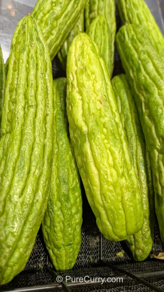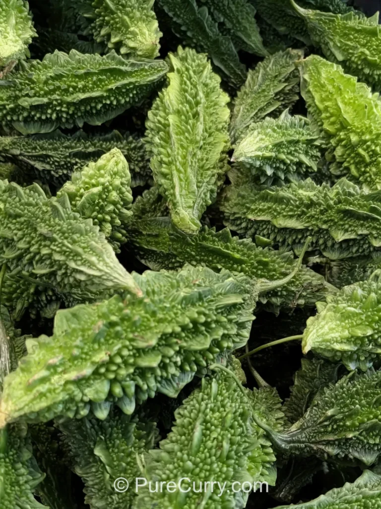 This is the variety most commonly used in Indian cooking. It’s narrow, dark green, and covered in sharp, jagged ridges. Its skin is thicker, its flesh is firmer, and its bitterness is bold and concentrated. This intensity is exactly why traditional Indian recipes rely on careful preparation and strong flavor partners.